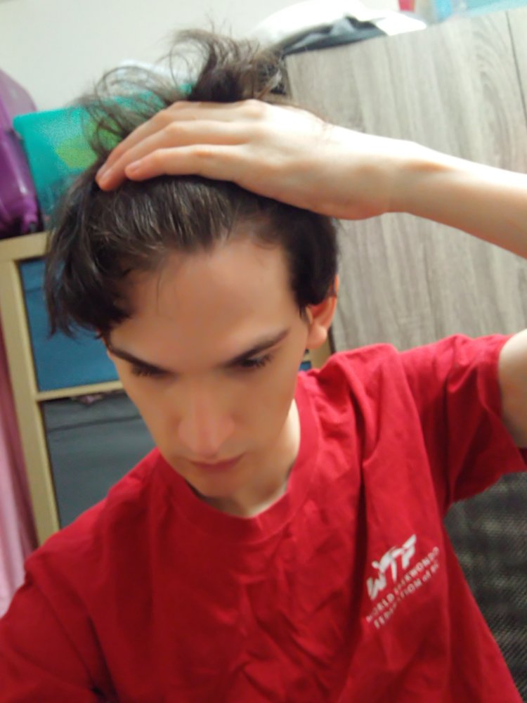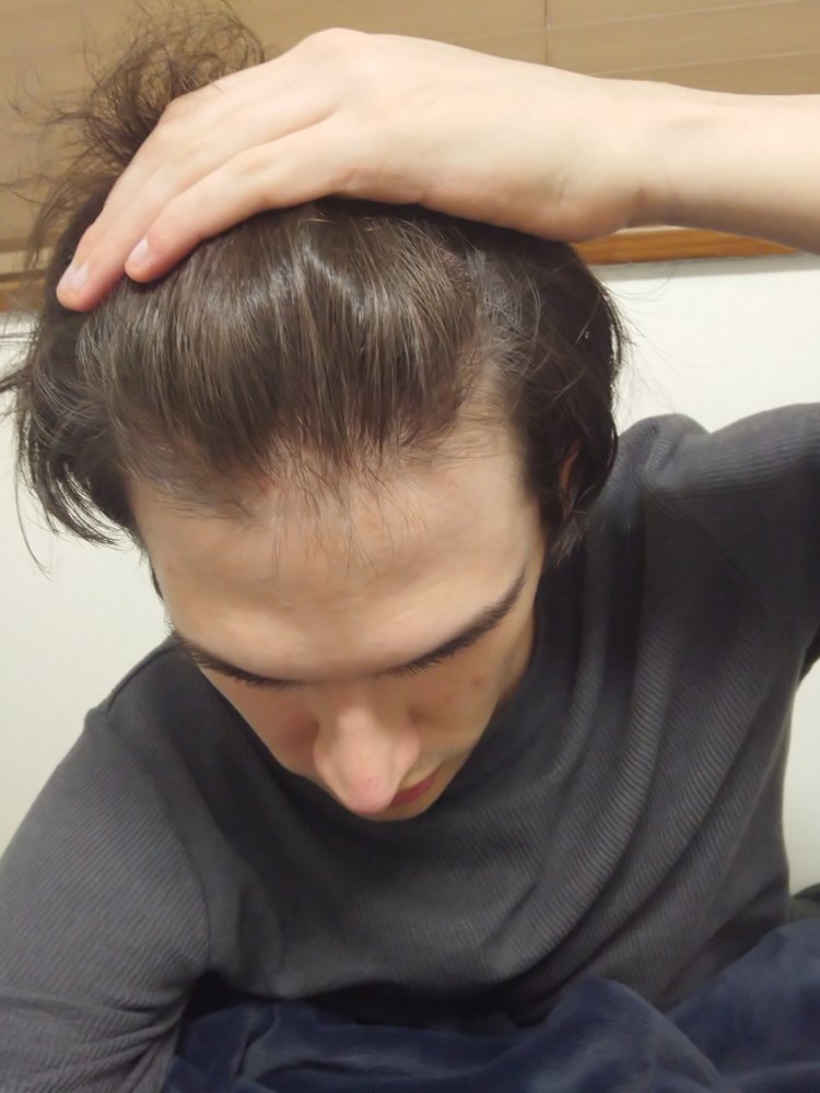 Here's pics i took just now, sorry the iso setting on the cam wasnt ajusted for window light but you can still see, still looks like utter sh*t, but then again i did stop minoxidil at the beginning of this treatment because i dont ever want to depend on minoxidil for my hair to grow, i just want real hair grown without needing a stimulant and im hoping no T + Estrogen will bring it back to life, i dont see any improvement yet. Looks like it might be the same or worse idk. The bags under my eyes are from taking DXM and tripping balls all weekend cause i don't want to think, but the bags are a sign its time to stop the DXM now lol.