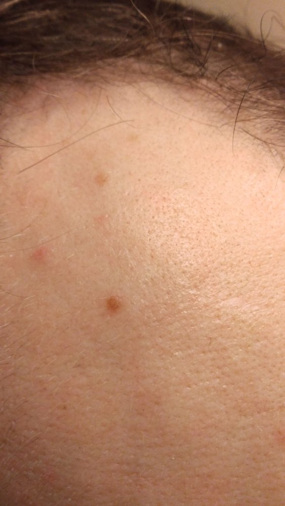on July 25th, I switched to taking Estradiol .75mg from Estrogel Everyday. On July 31st I noticed black dot things on my right temple. Use my 3 freckles for reference.