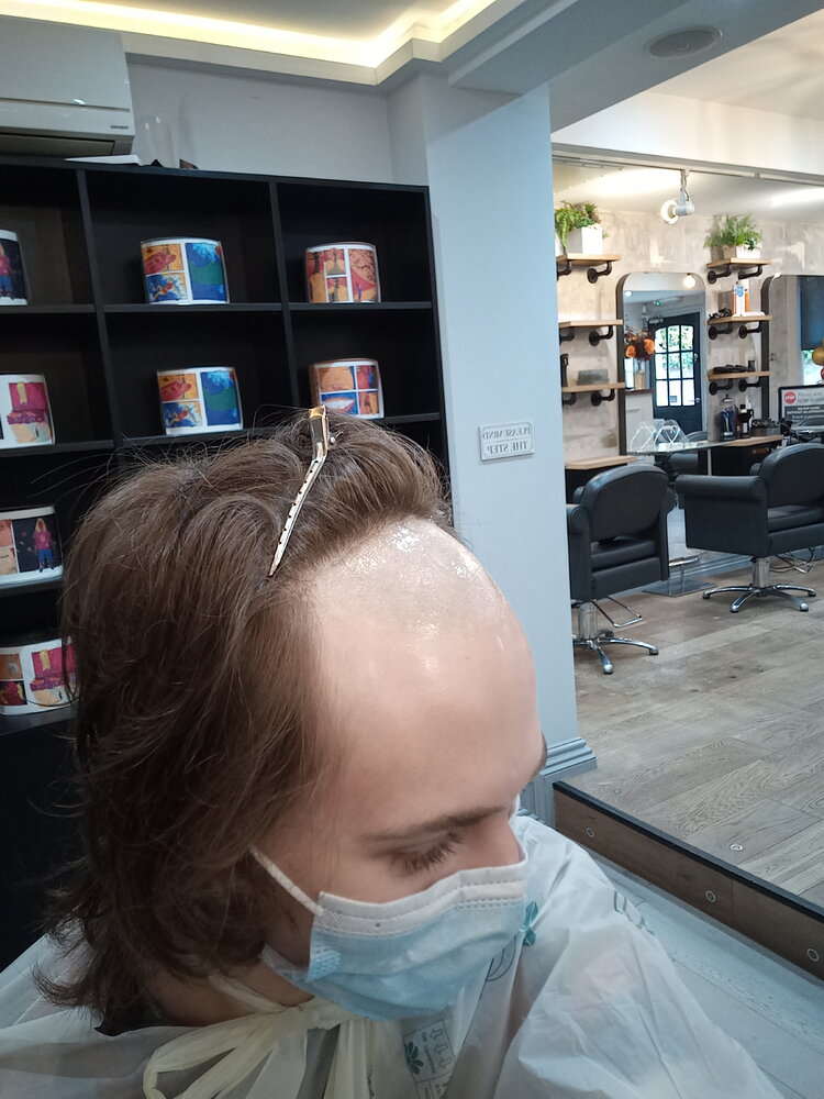 Sorry I shold have explained, you ned to shave the scalp to fit the system, if you look closely you can see the hairline at probably a NW3. The other 2 pics are of the hair system, it's almost undetectable in most lighting.