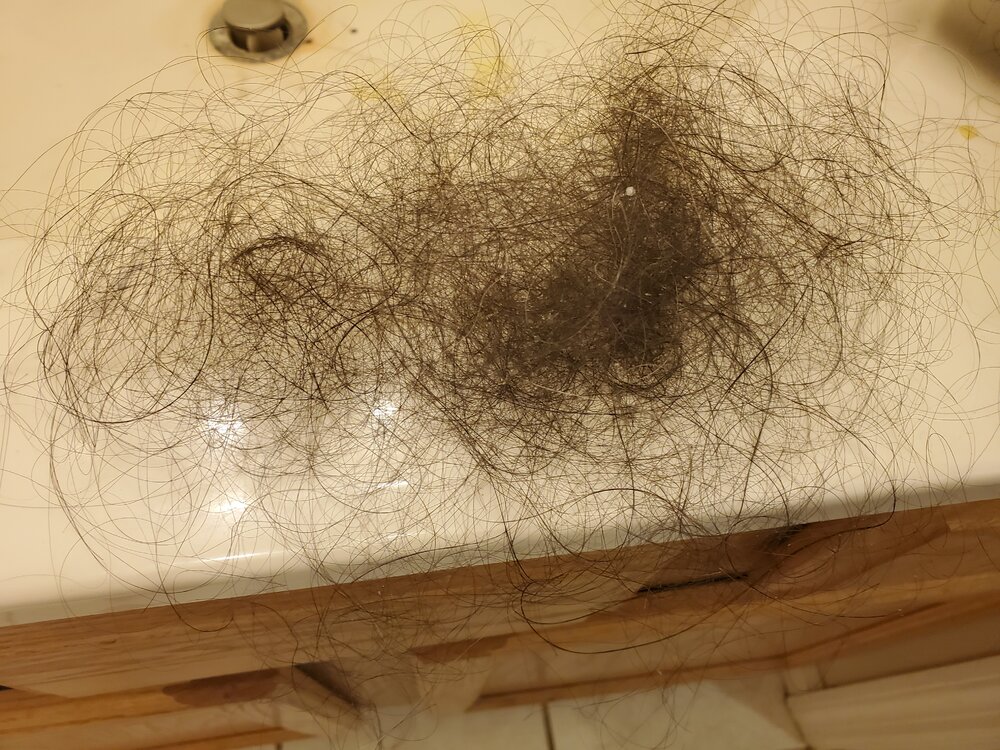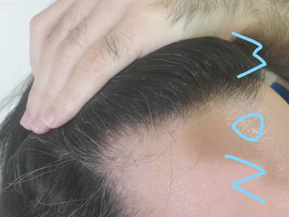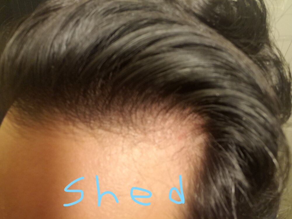 posted this in a different thread but figured i'd do it here. tried to upload them in order and label them accordingly. pre-trt you can see my temples are still rounded down, my hairline was actually lower in high school but it moved up a bit around 20-21 and stayed there. the red shirt pic is couple years on trt, you can see the temple has chipped out a bit, not a big deal. the white shirt i think you can obviously see my hair was healthy, still on trt. started water fasting 5 days a week, then the last pic are what i would lose every shower this went on for 2 years, maybe a little more. that pile is 1000 hairs, and this happened all the time. there's my hair and temples after all that damage which is the same all over my head. you can see when i hold it out all those thin wispy hairs, that was all thick heavy and you couldn't even see through it, its that way all over. and of course the last one is of my left worse temple, i put a small blue line to show where the hairline was originally. there are some smaller dark hairs the camera didnt pick up, but theyve been there for years and don't change. derm suggested it was also age related thinning, lack of nutrition for a couple years and chronic Telogen Effluvium may have spent some of my hairs lifespan, who knows. at one point i prob lost 70% density compared to what i had. inflammation markers were high so went over to carnivore diet and Doctor put me on hydrocortisone 10mg.