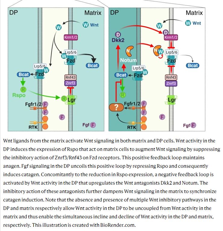Here is what happens in mice when you keep Wnt signaling high in the DP and silence FGFR1/2, delaying the reduction of R-spondins and the onset of catagen.