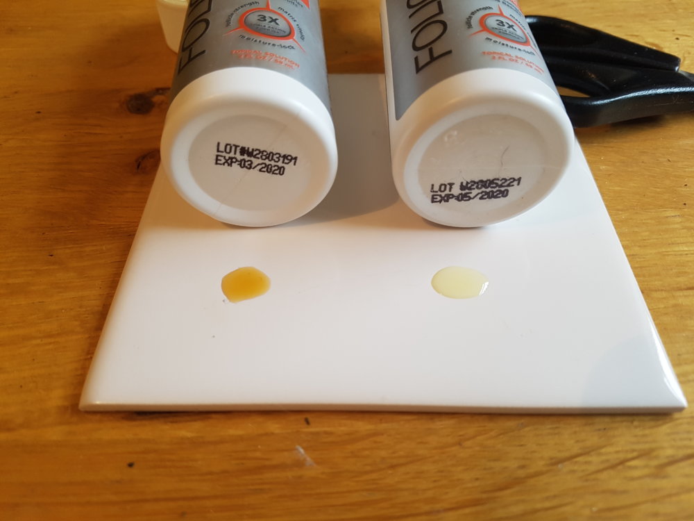 I reordered the same product from Biovea but this time the liquid is thin with a light yellow colour and very greasy, not brown and thick. It also smells a bit like cola but with a greater smell of alcohol to it. The clear plastic sticker holding the box shut at the bottom didn't look as neat as if it had been stuck on in a production line. The bottle of product inside had a plain foil seal though, which did give a little reassurance. Both my first bottle and my second bottle of the product have the same expiry date: 05/2020