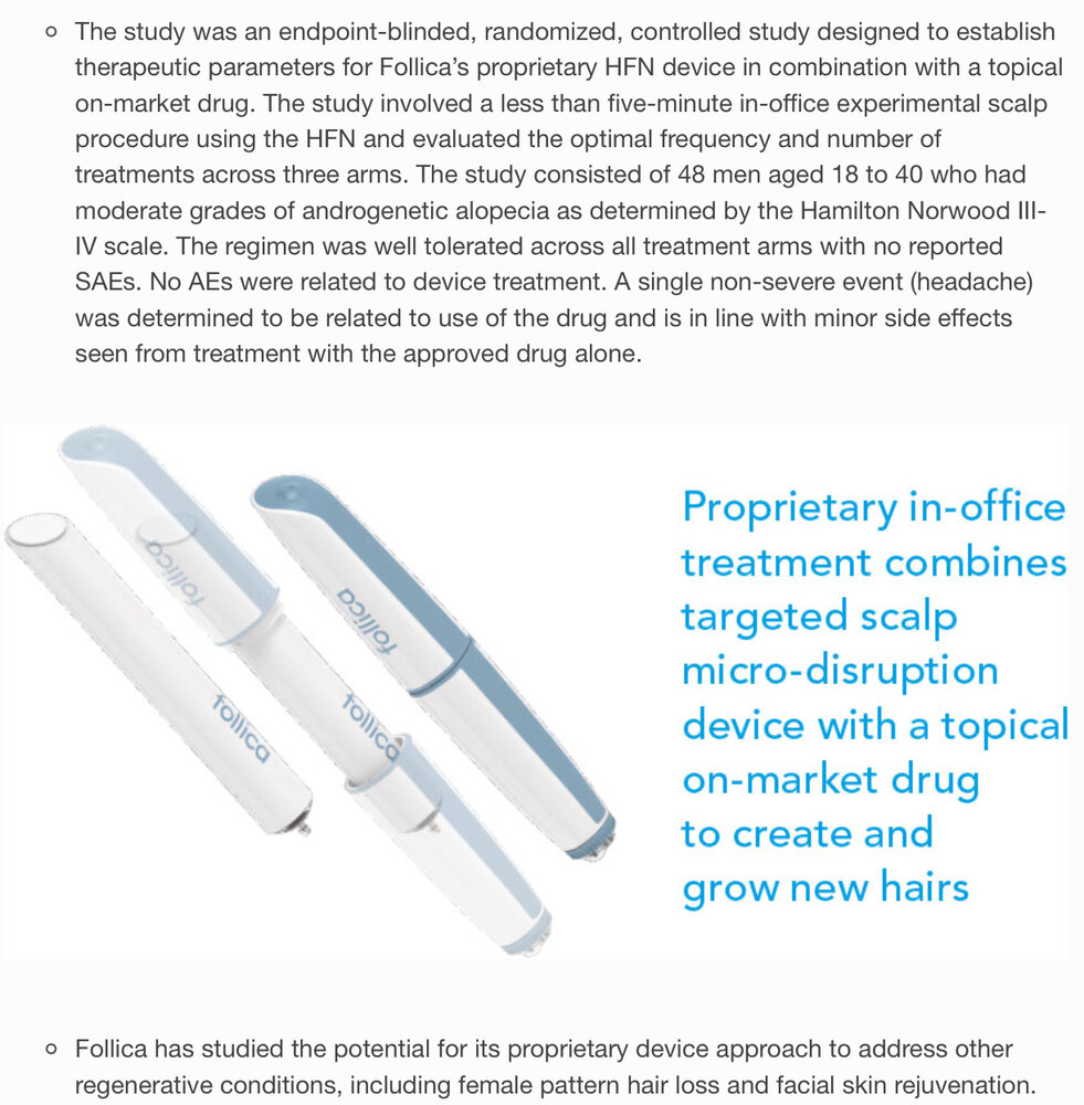 Follica is huge flop. Nothing in this treatment actually work to stop male pattern baldness , is just a stimulate mathod. The hair would wake up short term and then die fast after the androgena would kill the foliceles.