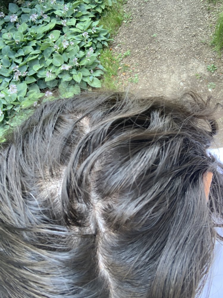 I still have a lot of hair. I’m just trying to stop this shedding. The change in density just from last year is significant. The length hides a lot. There’s cover but it’s completely flat now. In picture three you can see the scalp.