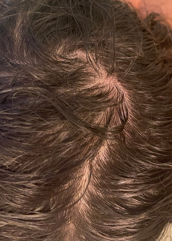 starting to get a bald spot at vertex crown. Temples very thin, many many short hairs everywhere because of the massive and constant shed.
