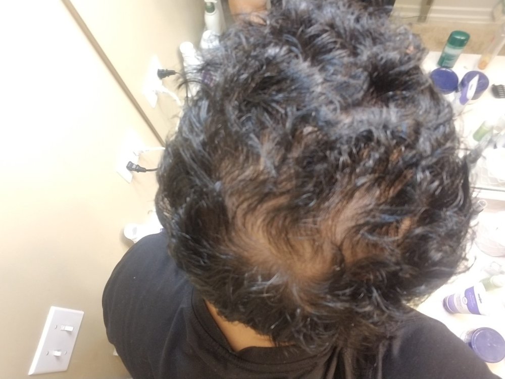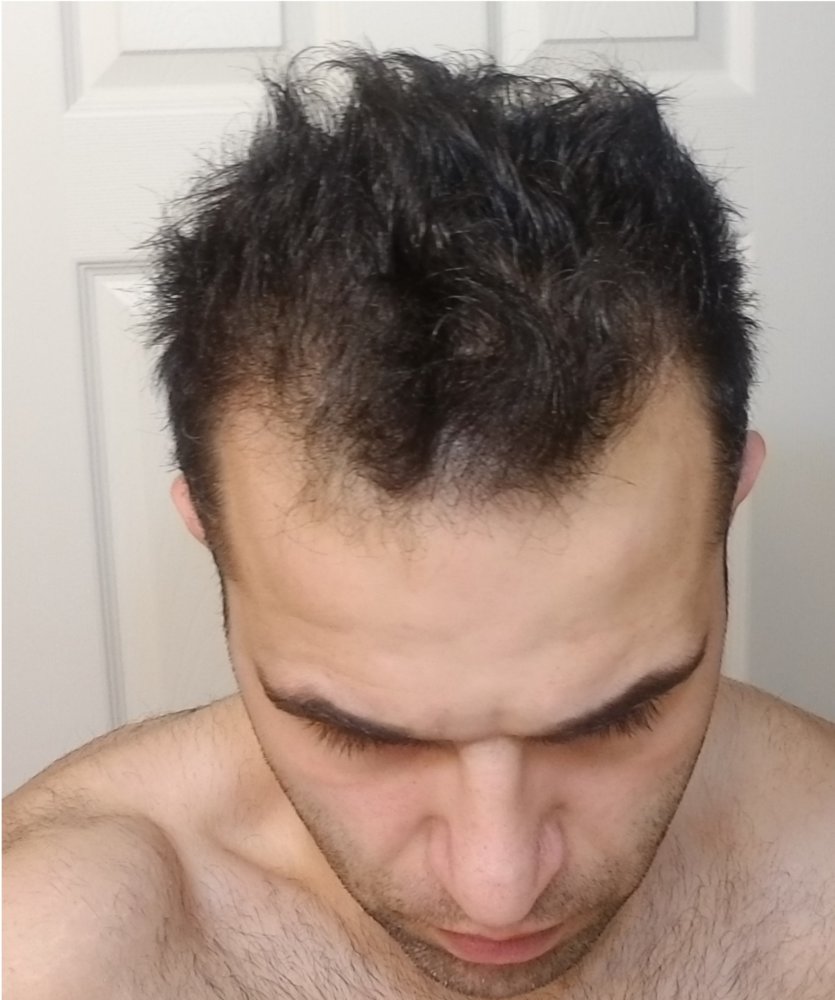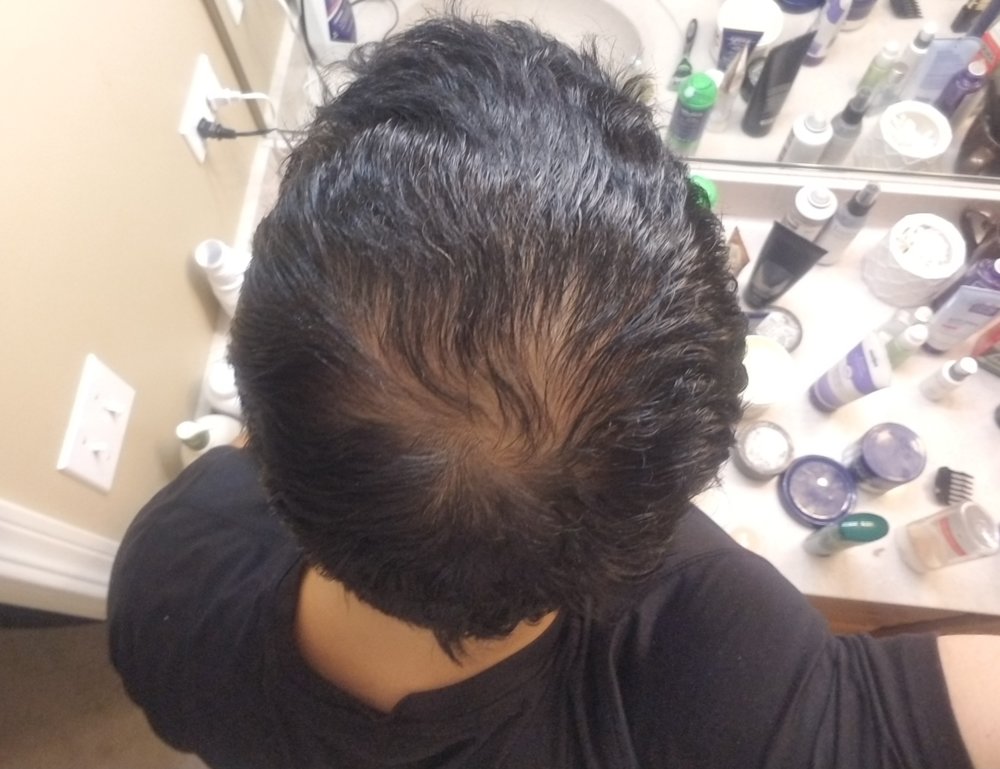 these pics are done to focus on how horrible the crown looks. My hairline is like a NW1.5. If I blowdry it and put some gel in it, most people don't even think I'm balding (the waviness helps a lot)