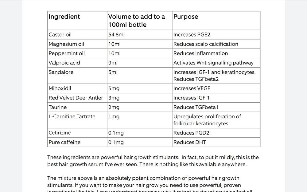 That's perhaps a little harsh. The ingredients are Minoxidil, VPA, Sandalore, castor oil, peppermint oil, tretinoin, taurine, carnitine, cetirizine, cysteine, velvet deer antler and caffeine. It's pretty good stuff.