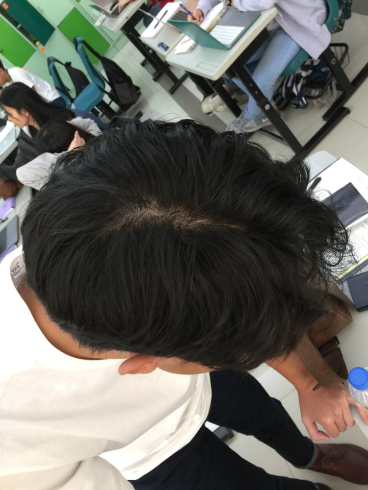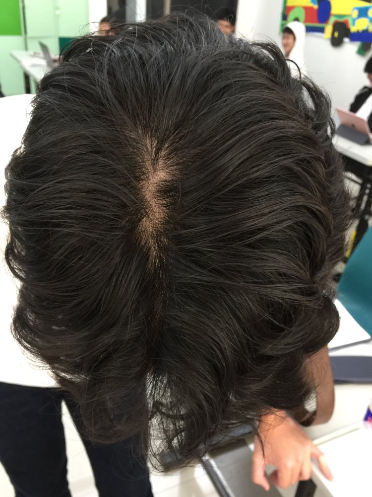 Hello! I am 16 years old and my scalp seems to be very visible from the top. My hair is long and wavy, like my mom's. My dad is borderline balding (still has a pretty significant amount for a 53 yr old but thinning is definitely present) and my mother's immediate male relatives have not experienced any sign of male pattern baldness. Attached are pictures from last week (white shirt) and pictures taken today (blue jacket). I think it has gotten pretty bad, and when asked, my classmates agreed. I take great care of my hair, and I am very much afraid of losing it.