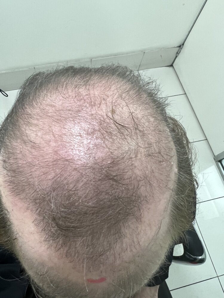 Before I just went in for my first hair unit appointment in a long time, my scalp looked red, was scaly and sore. It also had a lot less hair than in my Aug 2021 pic. I suspect this was shedding in response to the topicals and inflamation due to my daily microneedling across all my scalp.
