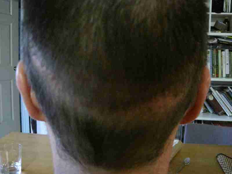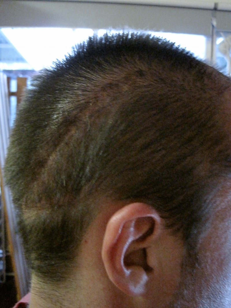Then into the chair, Mike one of the technicians (head technician maybe?) looked after me, taking my blood pressure giving me some relaxing shots (best part of the day!) and bandaging me up and getting ready for the strip to be taken out. Now - this is what really impressed me, I barely felt a thing for the strip and it seemed to happen really quickly and they did it while I was sitting up. Last time I was lying face down with no bandages that I can remember watching a pool of my own blood collect on the floor - a quite stressful experience, so I was very pleased and relieved with the ease in which this strip seemed to come out. From then on the strip was handed over to the technicians to cut up and everyone just knew what they were doing, they really had the system down pat - a world away from my previous experience where I swear the technicians were being trained on the day to cut up the grafts. I think there were around five or six people working away at any time.