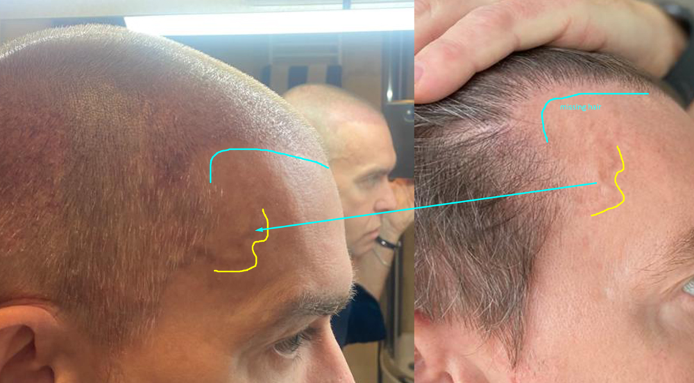 See the foto of the right side, before/after ,the vein in my forehead marked in yellow? the new hair are missing if we compare it to the implanted bulbs from. Same goes from the front : new hair grew in the front, but a cm back there is no density. So if we would have to look at a constant improvement, then the issue is that in some part the new hair are fully developed but 1cm back , there's empty space, no density... so if nothing came up in 7 months where the cyan arrow point, do you think new hair can develop so late after the operation? I can just hope so ...