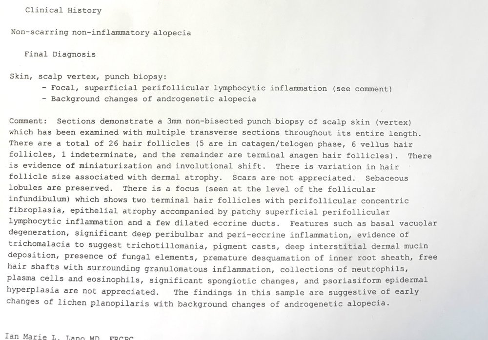 Since I had no luck with Dutasteride/Topical Finasteride/Nizoral/Minoxidil, I thought I would ask for a punch Biopsy. I'm glad I did.