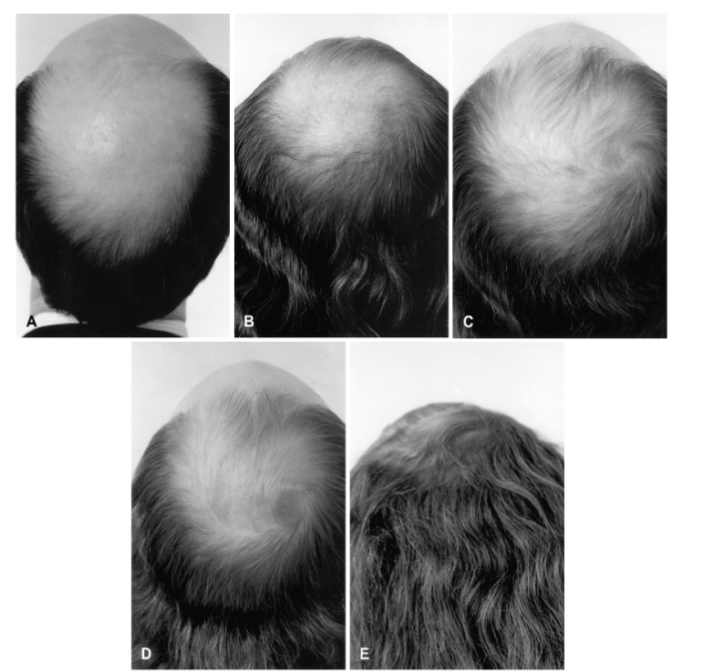 appreciable coverage on vertex. E, Almost full regrowth of terminal hair on scalp with some