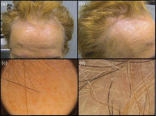Recession of the frontal and parietal hairlines and diffuse hair loss (Figure 1a and b) were observed. Miniaturization of follicles in the fronto-temporal area (Figure 1c) was revealed. Behind the scalp area sensible to aromatase, in the frontal region, the diameter of hair was normal without any alterations, with normal hair density (Figure 1d).