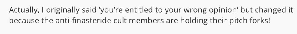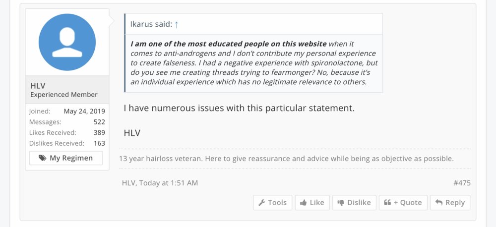 He just reads studies about transgender regimes over the internet and now he thinks that he is a hair loss expert, a doctor and scientists, all together and just after a couple of years of searching google for terms he does not really understand anyways.