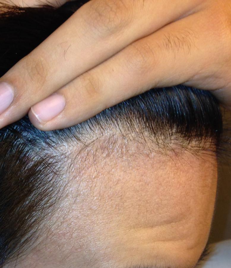 Here are better quality pictures of where my main concern is, my right temple. My derm noticed these hairs and said it takes a long time for the baby hairs to regrow. What do you think?