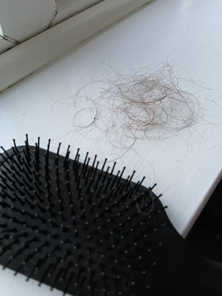 here is a picture, this is how much hair comes out each time I wash/ condition it and then brush it carefully.... I also use a spray in conditioner that’s meant to help with knots and tangles but as you can see, it doesn’t, no matter what I do, it knots like mad even when I just touch it!