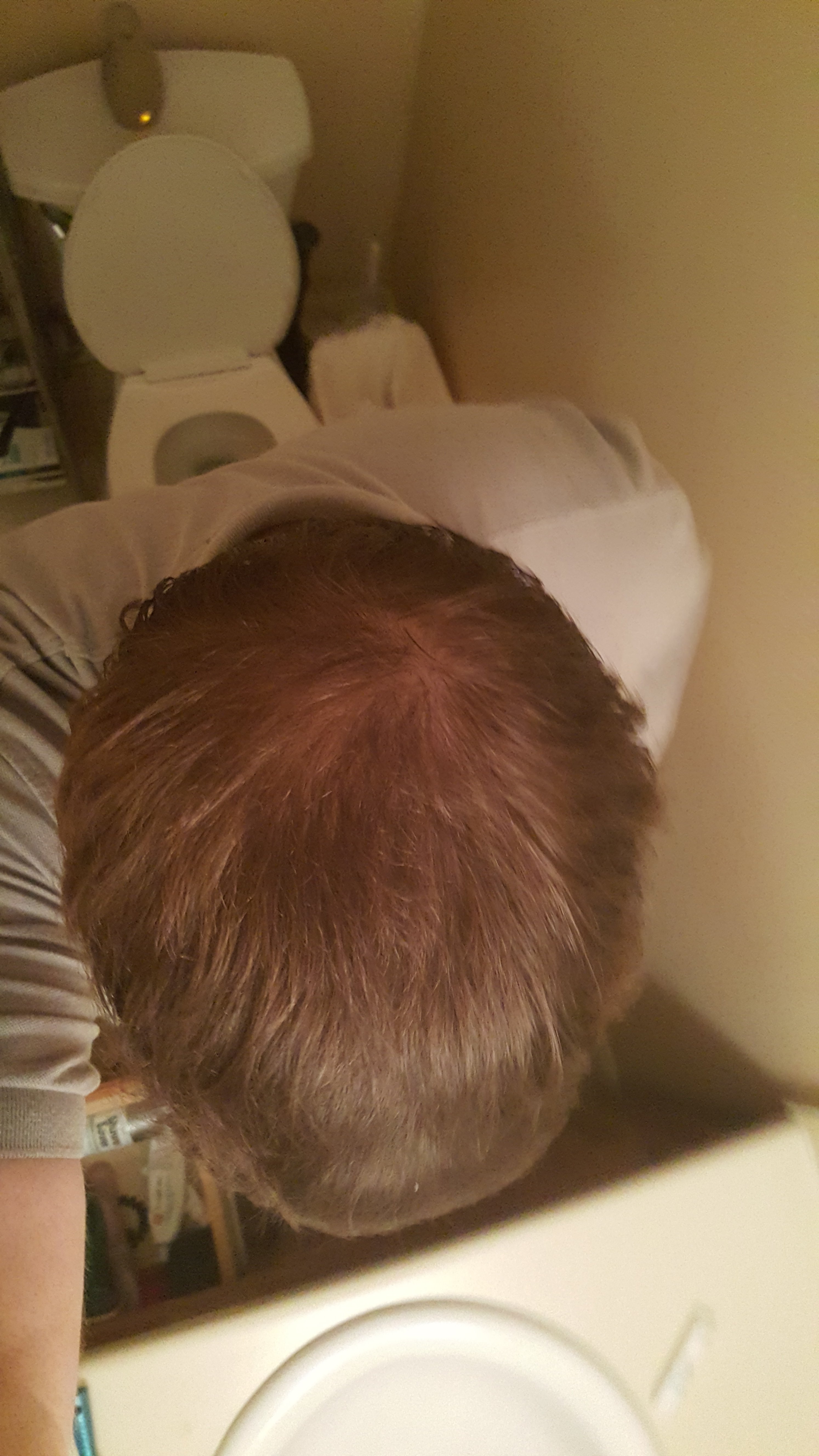 Hello everyone. I kind of freaked out earlier because for starters, I get pretty bad anxiety at times and second, I found out that when I lean over and take the picture, the light for some reason makes it look 50 times worse than it really is. Maybe it's the color of my hair I don't know. I showed a friend who said my hair looks nothing like the photo. I found out that taking a picture while not leaning down is more accurate. Let me know what you think.