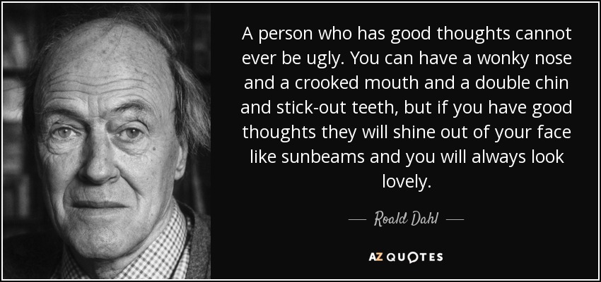 It's always a good idea to believe in someone who writes fantasy literature.A person who has good thoughts cannot ever be ugly. You can have a wonky nose and a crooked mouth and a double chin and stick-out teeth, but if you have good thoughts they will shine out of your face like sunbeams and you will always look lovely.