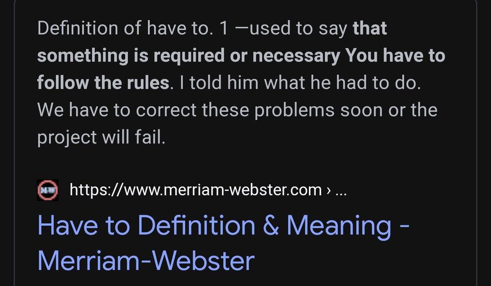 According to my 1st grade education and Miriam's Webster dictionary..... "Have to" means required or necessary. Your claim is that you didn't mean the words as you wrote them?