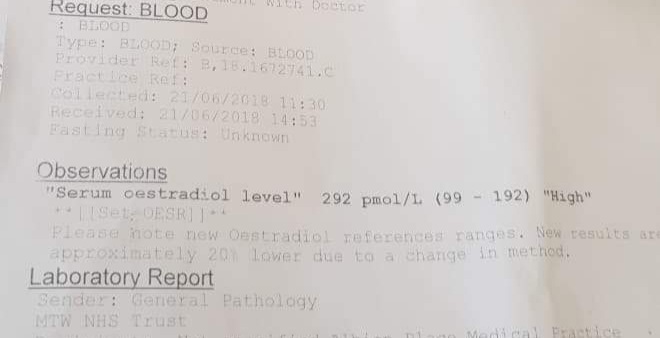 You need them to check for prolactin and SHBG because your test and estrogen are high I'm guessing as you're having sides those two will be out of sync. Something like this is the test they should carry out