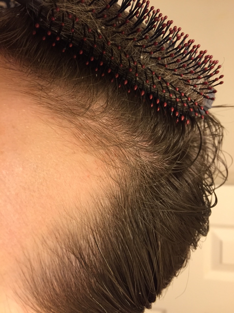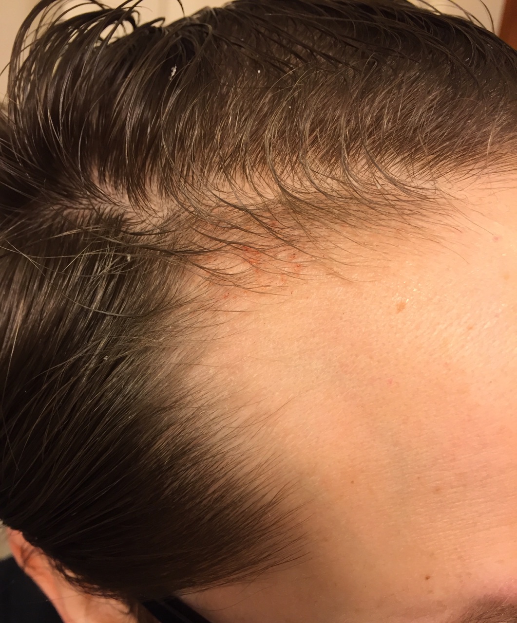 Anyways so I figured I would update how my temples are doing. I have some product in my hair here but hopefully you can still see it decently. I feel they are slowly improving, particularly the right temple (the first picture) seems to be really moving along. The redness/scabs are from my dermaroller from last night - I really go at it as I feel if you're not bleeding at least a little you're not really doing it properly.
