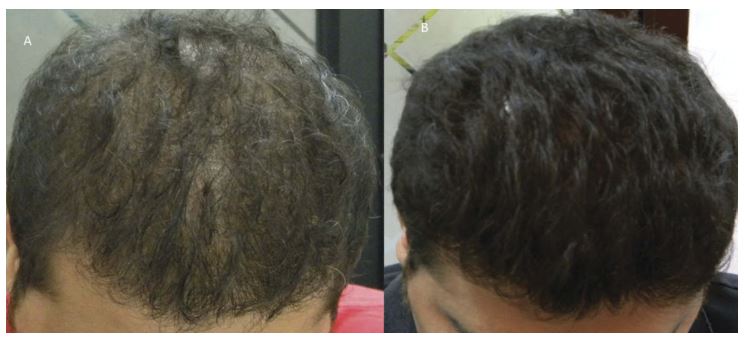 The full study shows some interesting results photos. Basically they use a cocktail of VEGF, FGF, IGF, copper tripeptide-1 (GHK-Cu or AHK-Cu), Keratinocyte growth factor and Thymosin beta-4. 60-70 injections were given per session and after eight sessions they note significant results. I think this is probably the most striking photo: