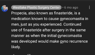 - male breast reduction surgery (doubts about this since some gland tissue is still left and resuming finasteride could cause the gyno to grow again?)