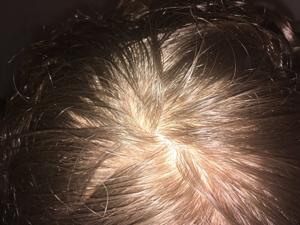 Second picture - Sunny day, hair parted to show the "worrisome"/cowlick part