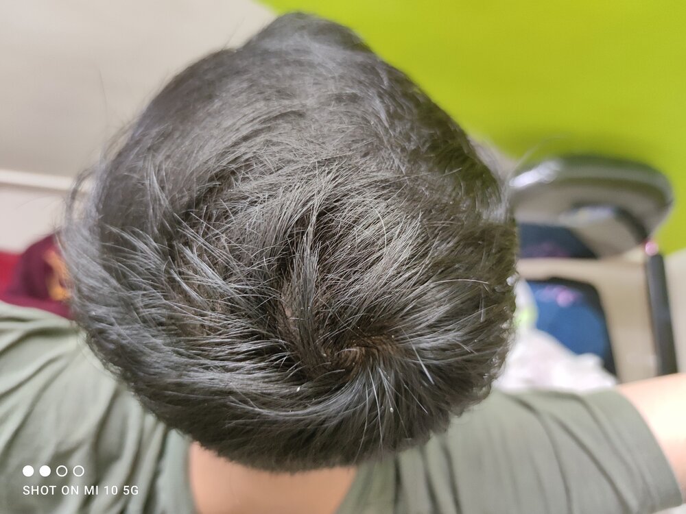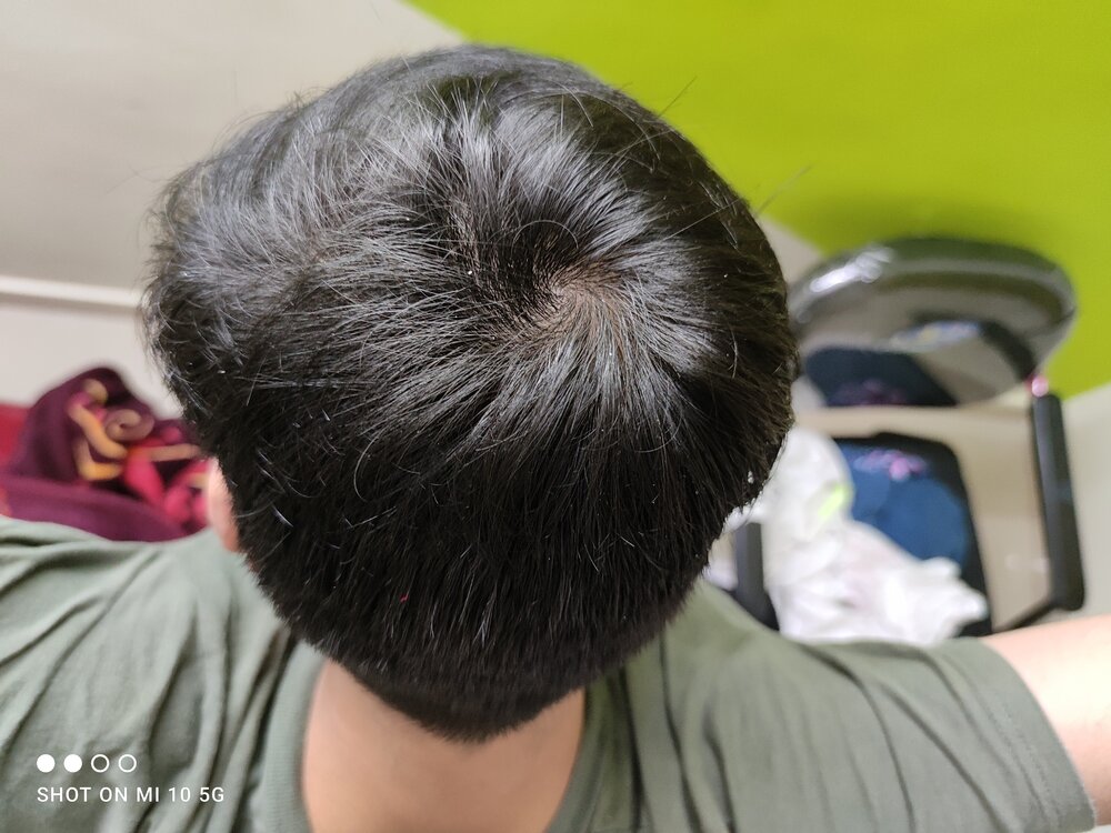 Your hair looks great. My hair is like yours and never changed. Dark hair plus light scalp, plus strong light and camera exposure can create a problem that isn’t there.Throw in greasy straight hair and it makes the situation even worse. Best way to check you hair is when clean and dry, in a mirror, with your own eyes to avoid the distortions caused by camera phones.Just for update and chronicling sake, this is how my crown looks after I shampooed my hair about an hour ago.