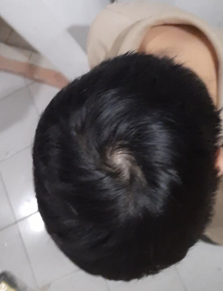 Looks like a whorl. Rest of the hair seems thick. Anecdotally, a lot of Asians report having an especially prominent hair whorl. Probably due to a combination of a very pale complexion and very dark, straight hair. Keep an eye out for the hair around the whorl growing thinner, that starts to be an indication of male pattern baldness.