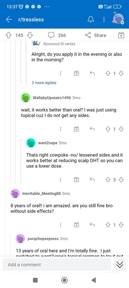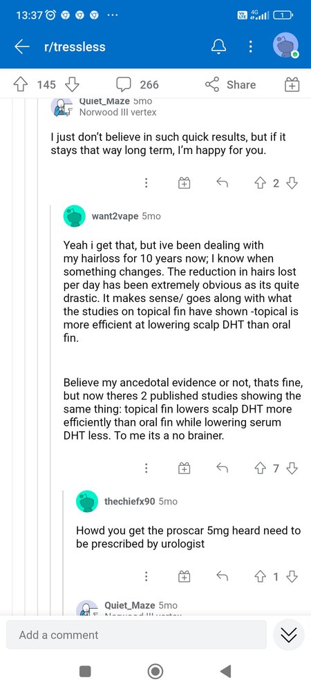 How often do you apply it and do you dermaroll at all and how often? Finasteride easily goes systemic when applied Topically without needling even because of its small moluculer Weight. You are having better hair because you are blocking more scalp dht this way I assume. I read it blocks 60% with topical finasteride and 40% with oral. You think this is why? Dutasteride topically and orally didnt do sh*t for me. Despite even needling sometimes and oral dutasteride at a high dosage blocks more scalp dht than topical finasteride ever could. I cant tolerate finasteride anyway so im stuck with dutasteride. Your hair is thicker but at a Price of having to apply it on your scalp everyday for the rest of your life and indanger other People including your girlfriend she can never touch your hair now without getting dried flakes of finasteride on her fingers and everywhere. Much easier and safer to just pop a pill and be done with it.