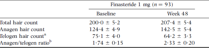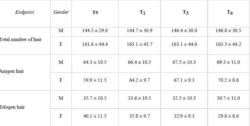 2)"No significant differences were observed in men regarding the total number of hair at any control visits in comparison to baseline, yet men experienced a constant improvement. At the end of treatment (6 months) 63.3% of them had experienced an increase in total hair number and the percent change of total hair count after 6 months was +1.6% compared to baseline."