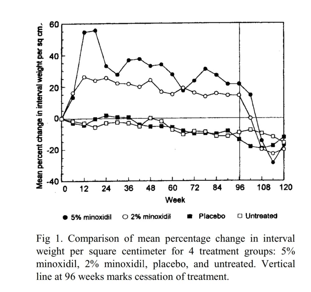 " This study demonstrates that 5% and 2% topical minoxidil promote hair growth and retard the hair loss process over 96 weeks, with 5% topical minoxidil having the greater efficacy. "