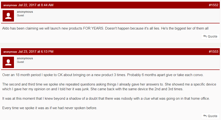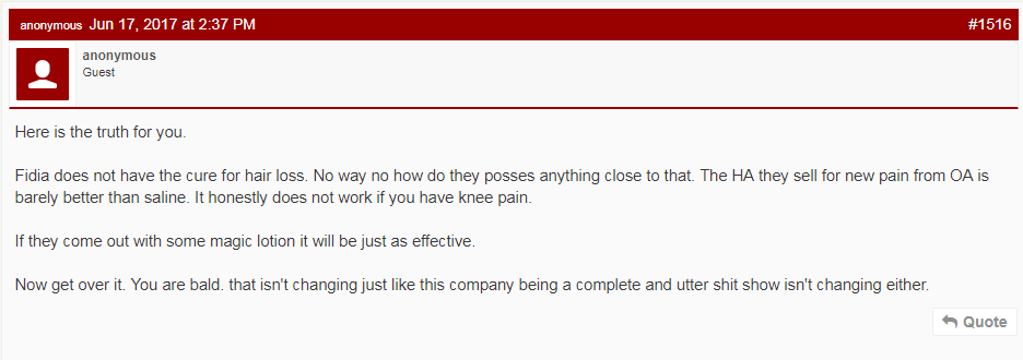 Indeed, I will agree with you all that obviously, that the USA branch of Fidia is in utter disarray bears no judgement on the company as a whole. Moreover, despite the fact that Fidia focuses on hyaluronic acid products at home and abroad, it is completely inappropriate and asinine to listen to these USA employees begrudgingly berate the efficacy of the HA product line and the rate at which new products are introduced.