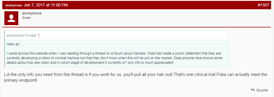 And there is especially no need to worry about the simultaneous lack of pictures demonstrating the proof of concept (i.e. that the lotion, optimized or not, demonstrates at least of some degree of hair growth), the lack of evidence that the lotion will continue to work and actually halt the miniaturization process as opposed to just providing a boost, like minoxidil (but the entire scientific community clearly has unanimous agreement that equol, without a doubt, powerfully and safely addresses DHT at the follicle - remember the groundbreaking equol presentations at the 2017 Hair Congress?) and the lack of evidence that a clinical trial is even progressing (I mean Fidia said that a trial is ongoing but that "an accurate time frame in which such remedy would be available cannot be defined yet," which is totally fair; "I don't know when it'll be done" and "It'll never be done" are, practically speaking, totally different. The former should inspire tremendous hope and dispel all skepticism, and the latter is something that the company would swiftly and publically announce, if it were the case) .
