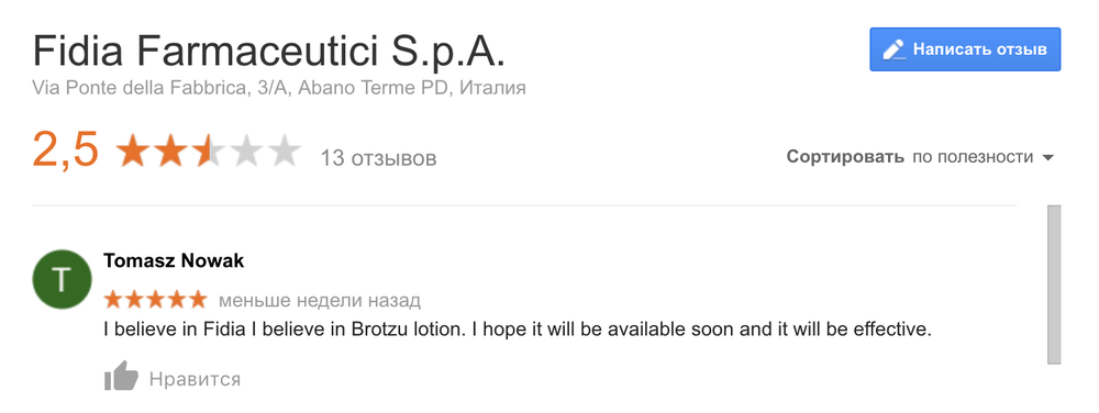 "If you guys really wanna get FIDIA’s attention and have them post some kinda news/information about the Brotzu lotion….just start one-starring their business page on google. In Google, search “Fidia Farmaceutici S.p.A. italy” and put a one star review, with a comment about Brotzu. I’m sure that would get their attention….and somehow get them to tell us what is going on with the Brotzu lotion."