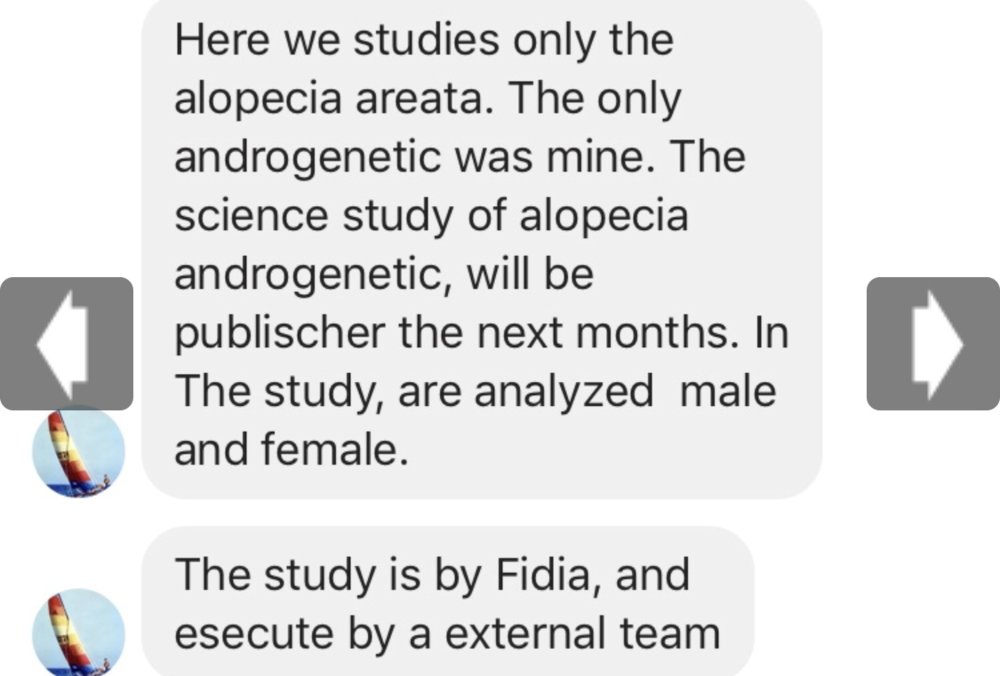 Conversation between @Clockwise and Brotzu’s son. The patent said the studies were done on both male and female subjects with various causes for hair loss. But in the conversation, that supposedly happened only a few months ago, he claims the first study was only done on alopecia areata (which often goes away or is solved with steroid injections anyways as I understand). My hopes are much lower now, f***.