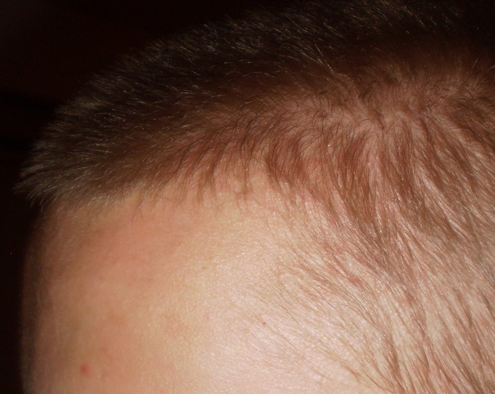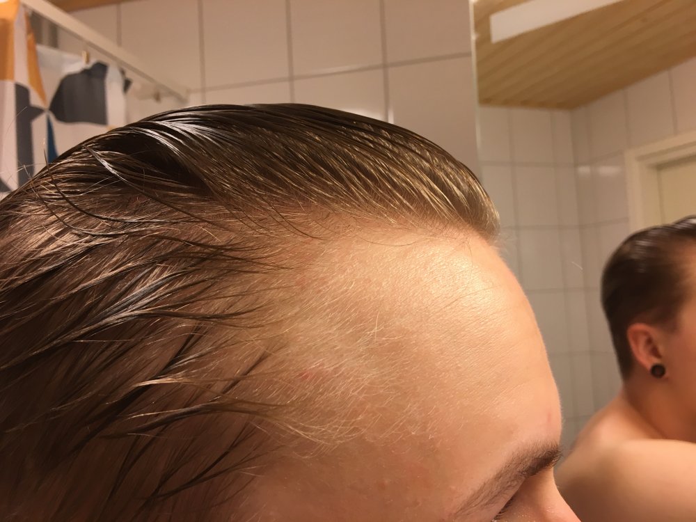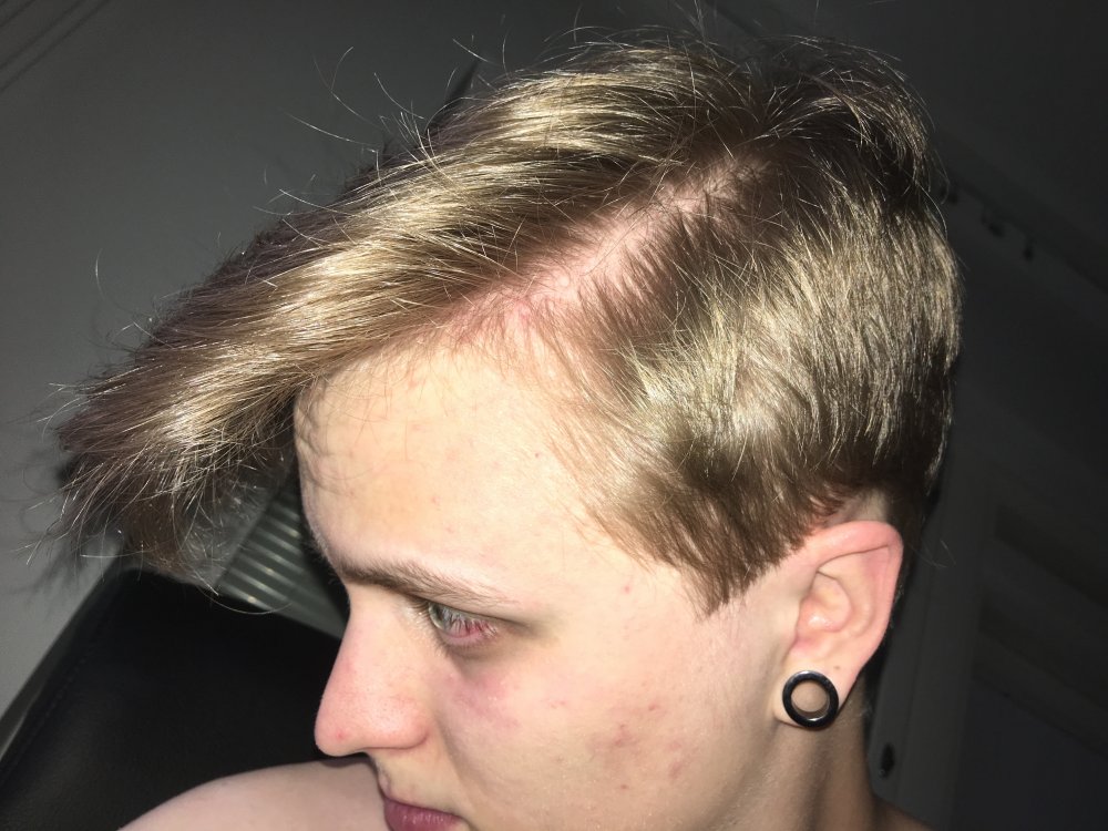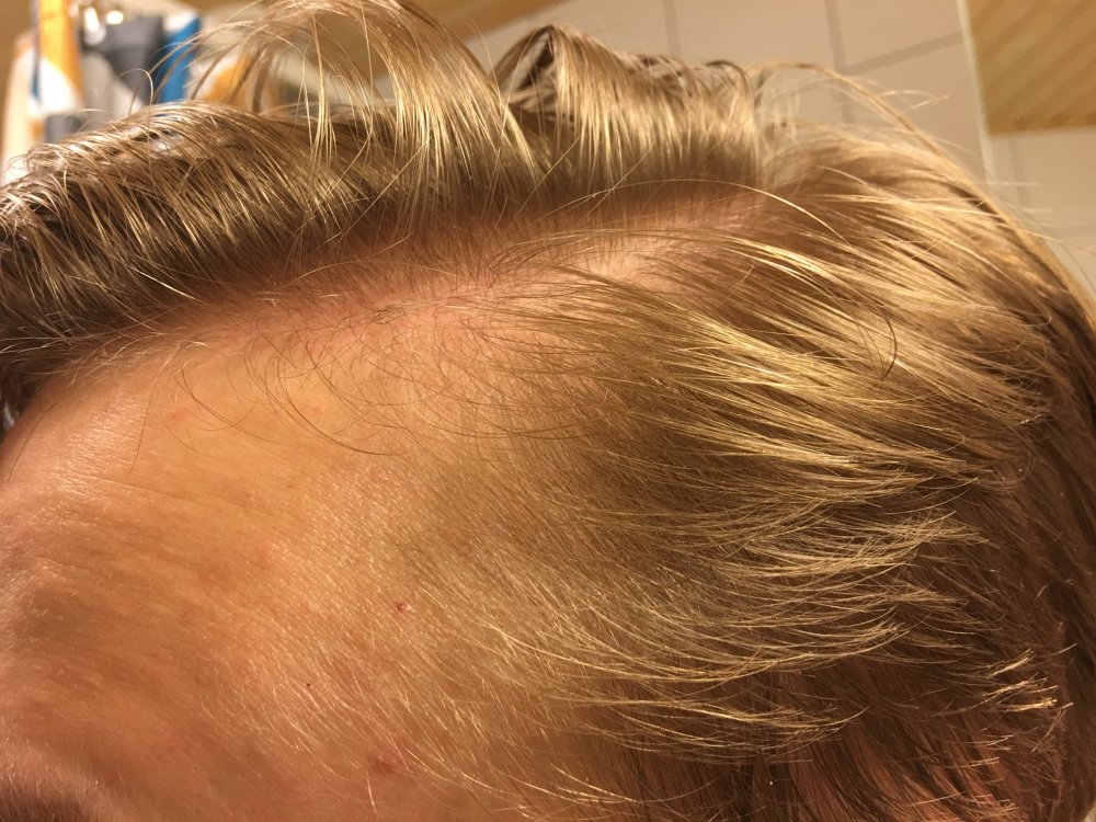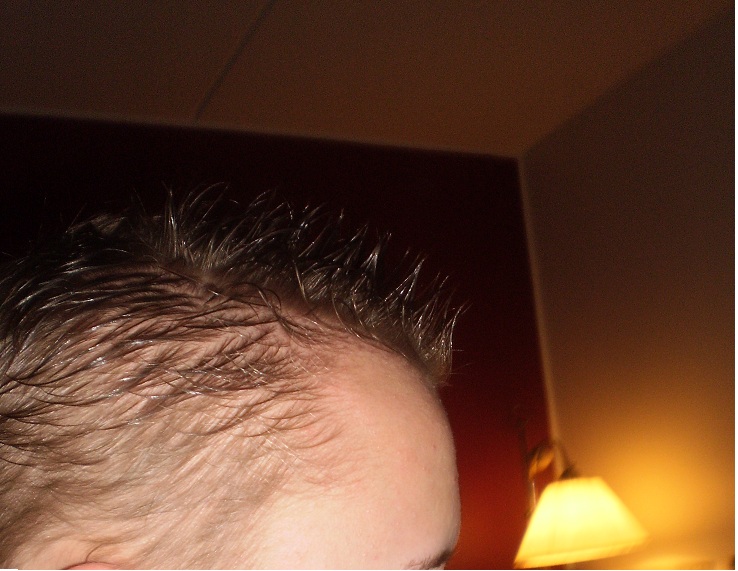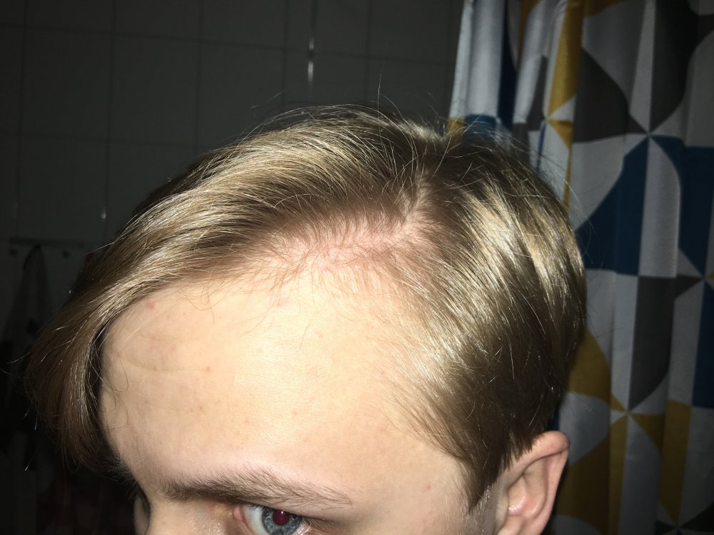In some pictures u can clearly see the minituarized hair from right temple. Never had minituarized hair there before this summer I think.. Also scalp is very visible from top
