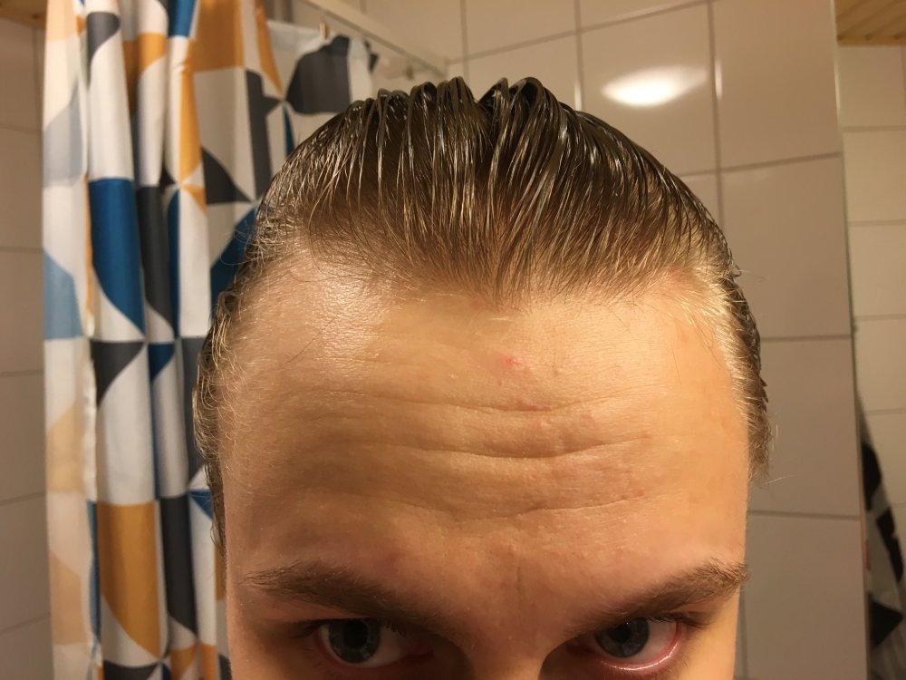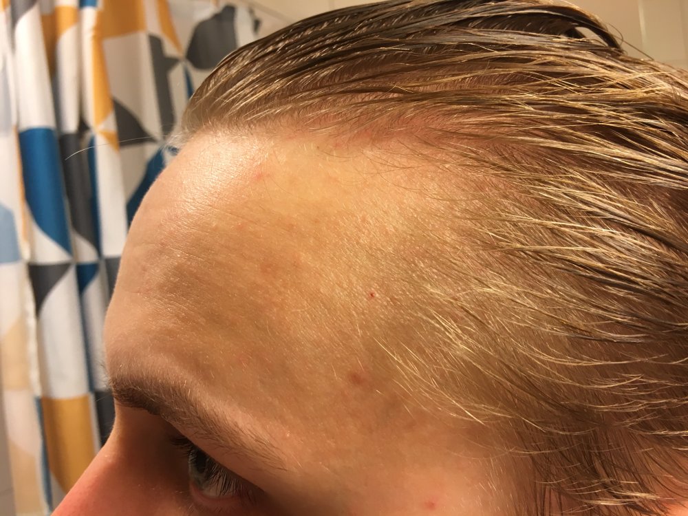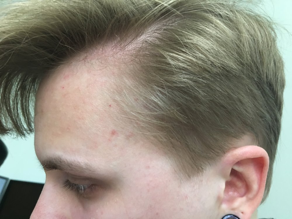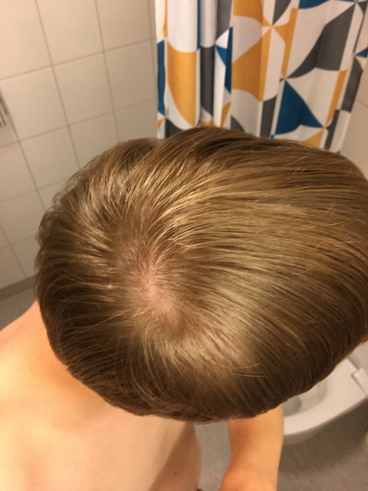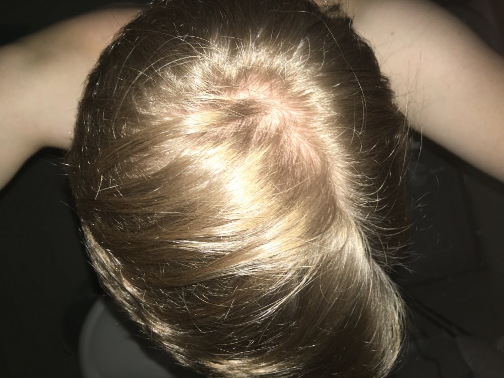 In some pictures u can clearly see the minituarized hair from right temple. Never had minituarized hair there before this summer I think.. Also scalp is very visible from top