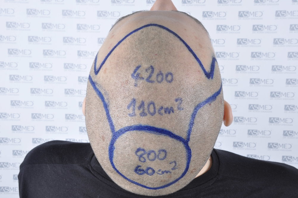Have to ask this too..... The doctor has written the density on your head with blue markers. Is this the native density? Surely no one can do over 100 grafts per cm2. Also, though you say you're an NW3, it seems that your hairloss was far more advanced than just that.