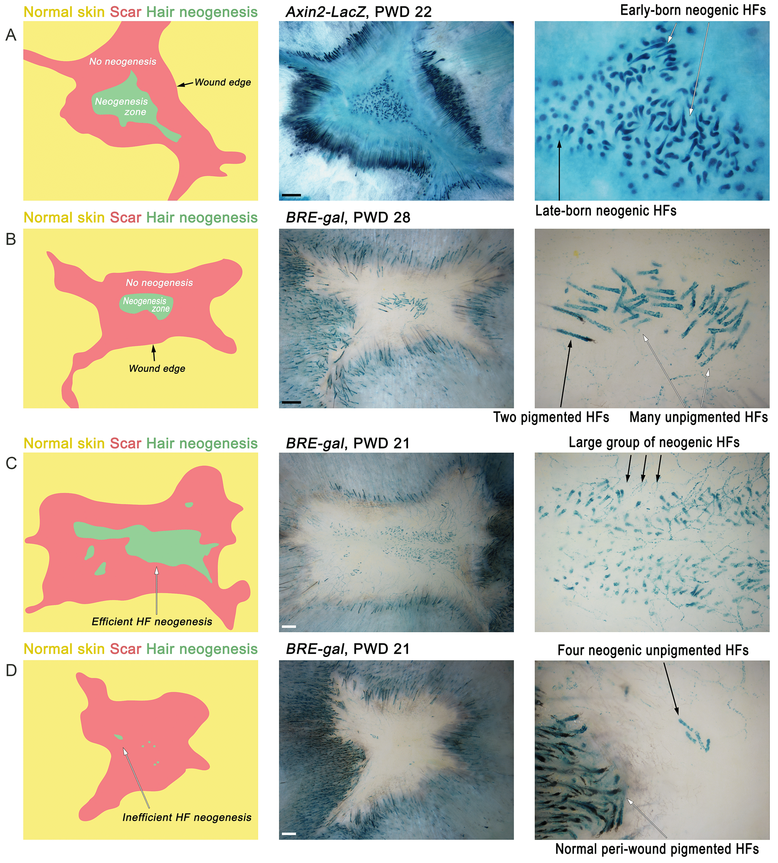 "Distribution and orientation of neogenic hairs in regenerated wounds. (A) Commonly, regenerated HFs form one large cluster (also see Fig. 3). One or a few small secondary cluster(s) can also be present. (B) Seldom, multiple small de novo HF clusters can form (eight clusters here). (C), (D) Orientation of de novo HFs can range from seemingly random (D, purple region; also see Fig. 3) to unidirectional. Commonly, the neogenesis zone can contain several sub-clusters of HFs with distinct orientation (C). Hairs have similar direction within a sub-cluster, but often opposite of that in the neighboring sub-cluster (white vs. black in C and D). Here, WNT pathway reporter BAT-gal (A−C) and BRE-gal reporters (D) were used to aid visualization of neogenic hairs as strongly lacZ-positive. Size bar 1 mm."