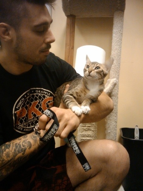 here is a tatted up guy with kitten...softens him up...girls go 'ahhh' he must have a sweet side he won't actually 'kill' me. He likes animals. Serial killers practice on animals. He is safe yey!!!