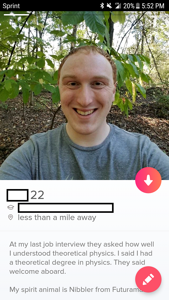 I bet if he put how kunfident he was and how many showers a day he takes in his bio his phone would malfunction from all the chicks hitting him up.