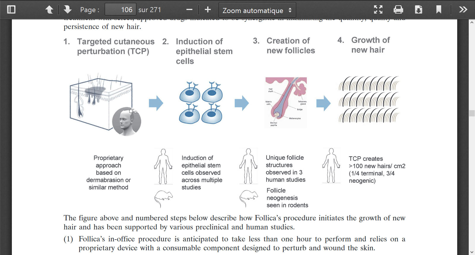 The appropriate category of product (medical device, drug or biologic) is determined by the primary mode of action of the product. Follica’s lead product candidate operates primarily by its TCP device. Drugs already in receipt of FDA approval will be used in conjunction with Follica’s TCP device without change to their route of delivery or indication. Therefore, Follica’s lead product candidate is anticipated to be regulated as a medical device Assuming a successful read-out of its next clinical study (i.e. after demonstrating that Follica’s lead product candidate can stimulate cosmetically significant hair growth through TCP and at-home application of an approved drug) Follica expects to seek regulatory approval in the US in late 2017.