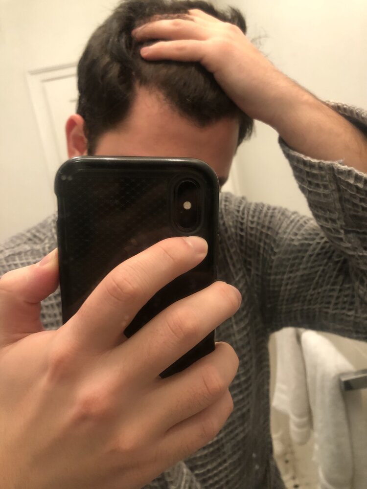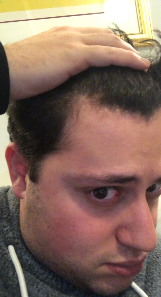 Ok so just wanted to post some prog after a few weeks on the hair vitamins prescribed by the Doctor. This is out of the shower, hair is lightly damp but not wet, did one not pushed back and then pushed back to show hairline. Also posted one from during the day today to show what it looks like normally when styled. I use a blowdryer and paste which im wondering about re considering. I can def see miniaturization in my corners, but also may be baby hairs growing bc of the vitamins.