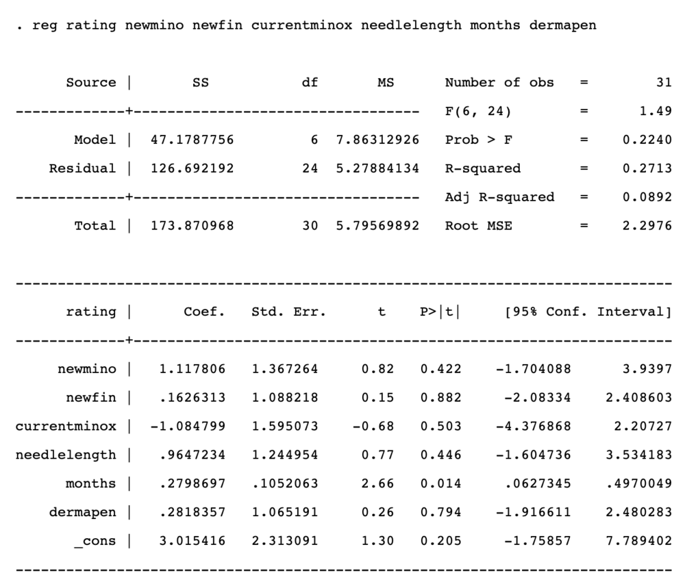 the regression table. p-value should be less than 0.05. This is the case only for months of usage. But a HUGE caution about the sample size, and the biased nature of it. Also most people used minoxidil, not all, so you can't get enough variation to test that part.