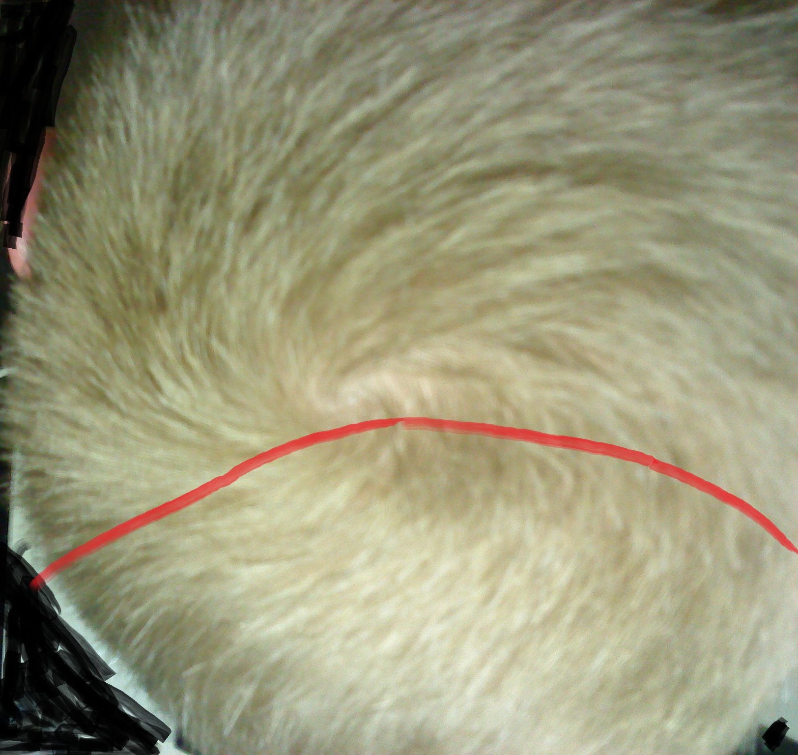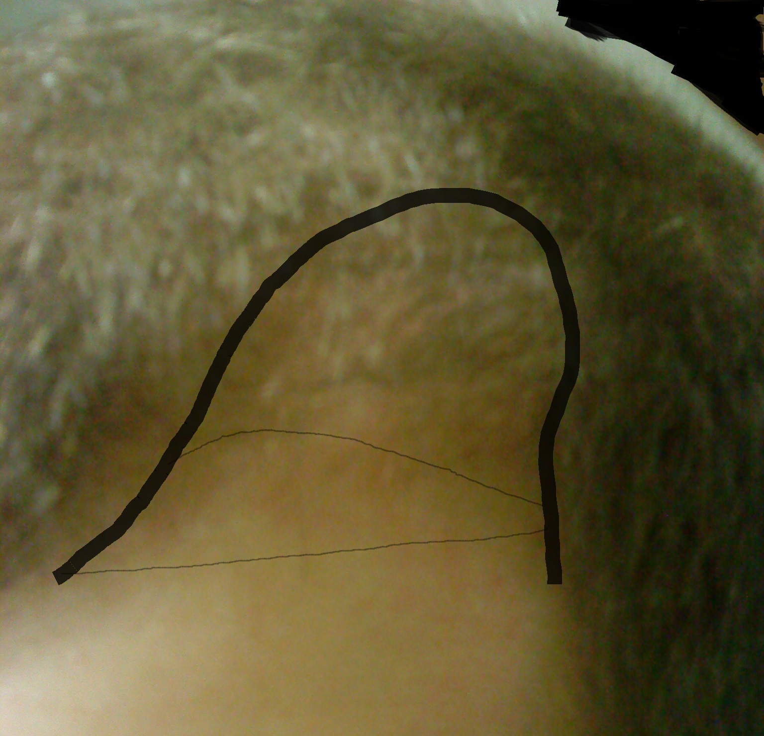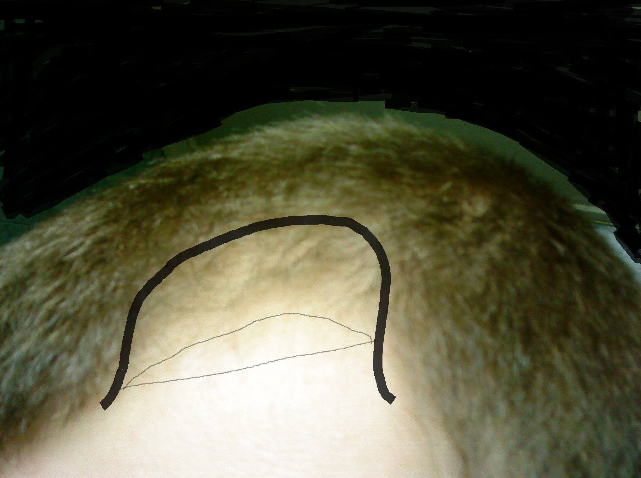 Temple. The thick line show where my old hairline was. The 2 small lines show where i see new recent tiny, tiny hairs sprouting up. The lightening is down so you can see the hair better cus my camera cant capture them in full light. It dont look so thick in real life: