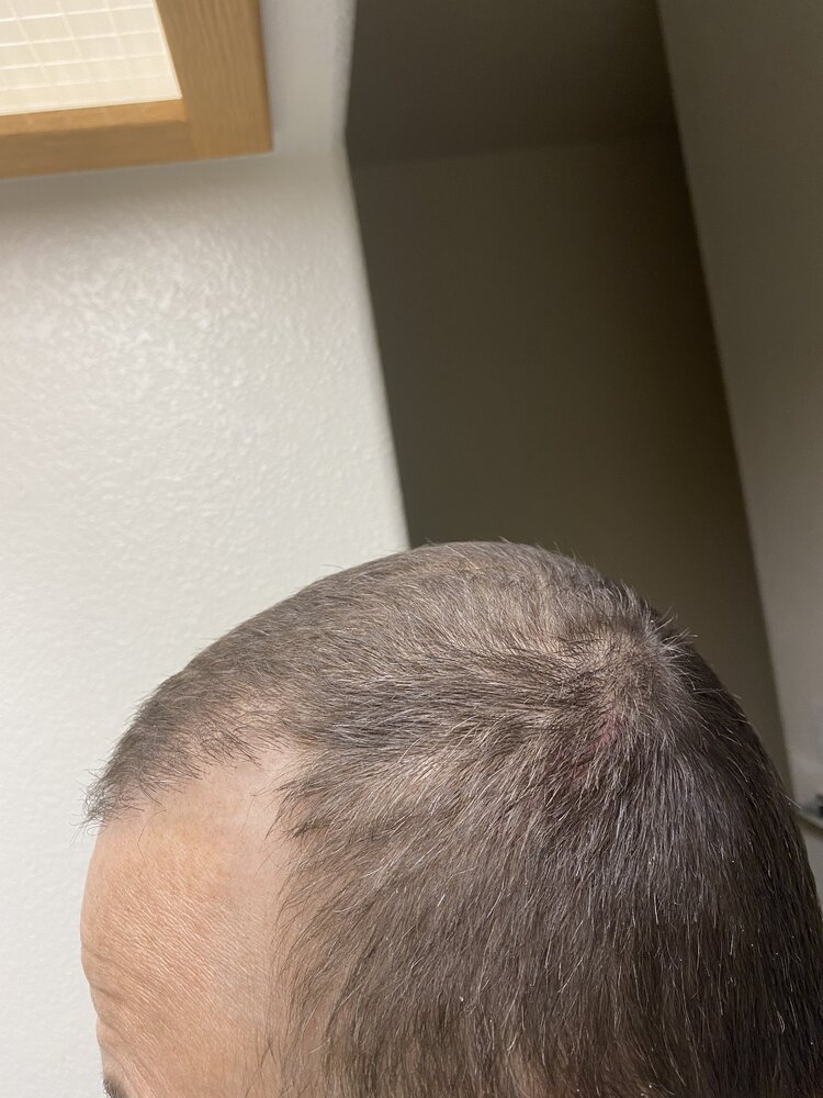 Just a quick update. Been taking msm 5-10 grams for 15 days, usually split at 8am then midday, no later to avoid insomnia, although the magnesium helps with this. Also spray bottle once or twice a day with 50 percent water 50 percent msm and some magnesium flakes. Then towel dry. Condition of hair is still a lot better than usual, grip texture etc. Very little shedding, almost none noticeable anyway. I'm posting a pic of my scalp, ive not taken a close up like this before but it genuinely looks like small dark hairs are sprouting in the pic. Doesn't look normal. This is midway from hairline to crown. And bear in mind I have considerable diffuse thinning for years. Time will tell. If its working I don't think I'll have to wait to