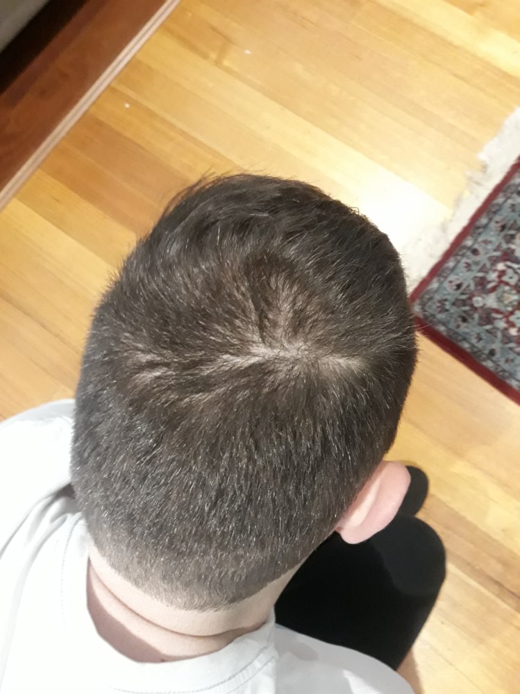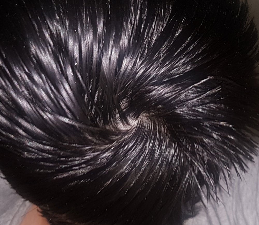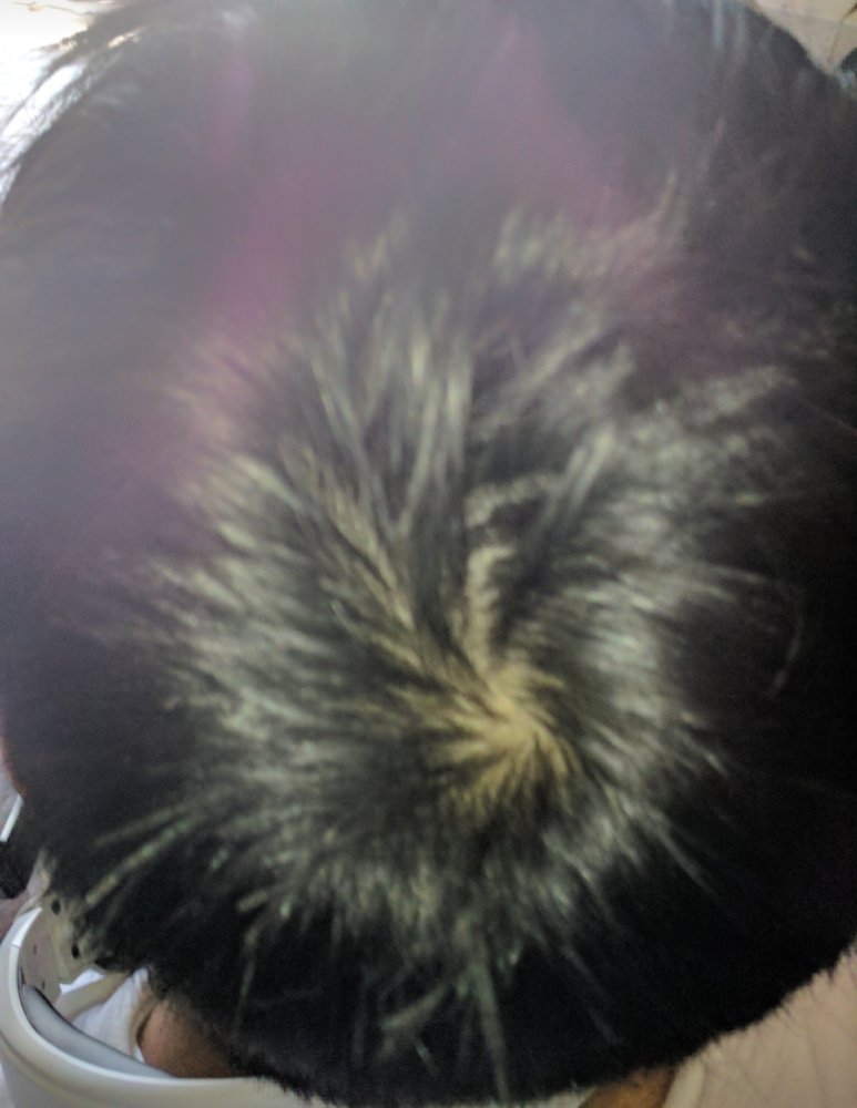 A lot of people have a large whorl directly under bright light. It could be diffusing, or it could be his natural hair. If all else looks fine then I wouldn't worry.